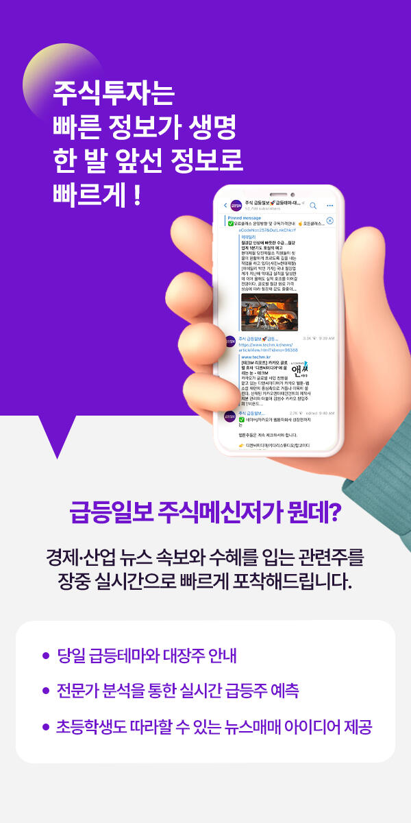 무료 주식투자 텔레그램 ‘급등주 포착’에서는 시황, 뷰, 종목 추천, 실시간 뉴스 등 양질의 정보를 무료로 제공하고 있습니다.다음 급등주가 궁금하다면?’급상승주 포착’으로 들어와!!매일 수익 인증이 나온다?아직 수익을 내지 못했어? 돈을 벌고 싶다면? 클릭! https://t.me/investmarketiv